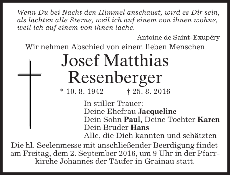 Hier finden Sie alle Traueranzeigen aus der Zeitung, die bisher für Josef Matthias Resenberger erschienen sind. Weitere Traueranzeigen, die in der Zeitung erscheinen, werden hier ebenfalls aufgelistet