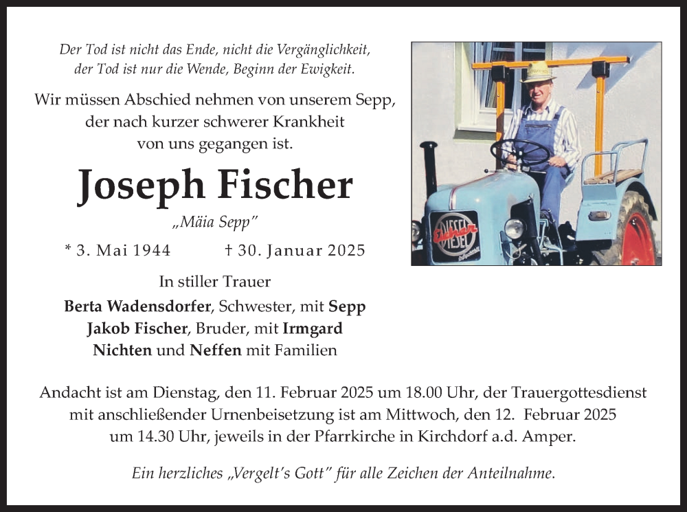 Hier finden Sie alle Traueranzeigen aus der Zeitung, die bisher für Joseph Fischer erschienen sind. Weitere Traueranzeigen, die in der Zeitung erscheinen, werden hier ebenfalls aufgelistet