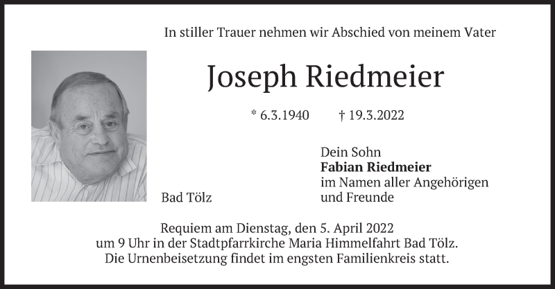 Hier finden Sie alle Traueranzeigen aus der Zeitung, die bisher für Joseph Riedmeier erschienen sind. Weitere Traueranzeigen, die in der Zeitung erscheinen, werden hier ebenfalls aufgelistet
