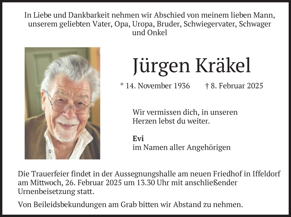 Hier finden Sie alle Traueranzeigen aus der Zeitung, die bisher für Jürgen Kräkel erschienen sind. Weitere Traueranzeigen, die in der Zeitung erscheinen, werden hier ebenfalls aufgelistet