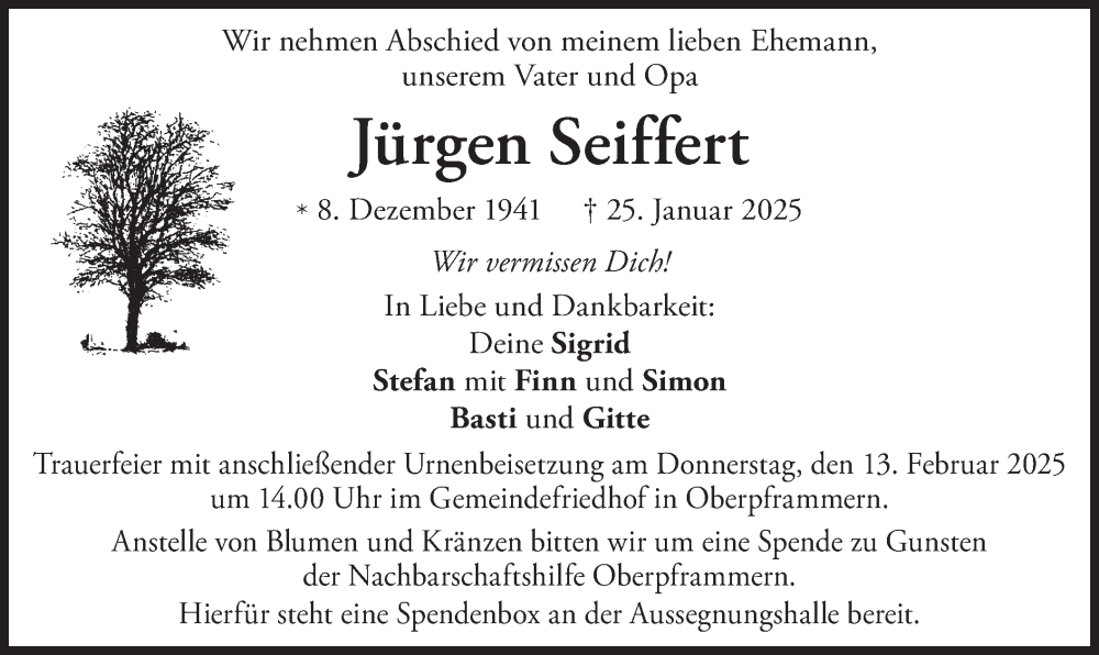 Hier finden Sie alle Traueranzeigen aus der Zeitung, die bisher für Jürgen Seiffert erschienen sind. Weitere Traueranzeigen, die in der Zeitung erscheinen, werden hier ebenfalls aufgelistet