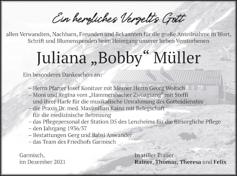 Hier finden Sie alle Traueranzeigen aus der Zeitung, die bisher für Juliana Müller erschienen sind. Weitere Traueranzeigen, die in der Zeitung erscheinen, werden hier ebenfalls aufgelistet