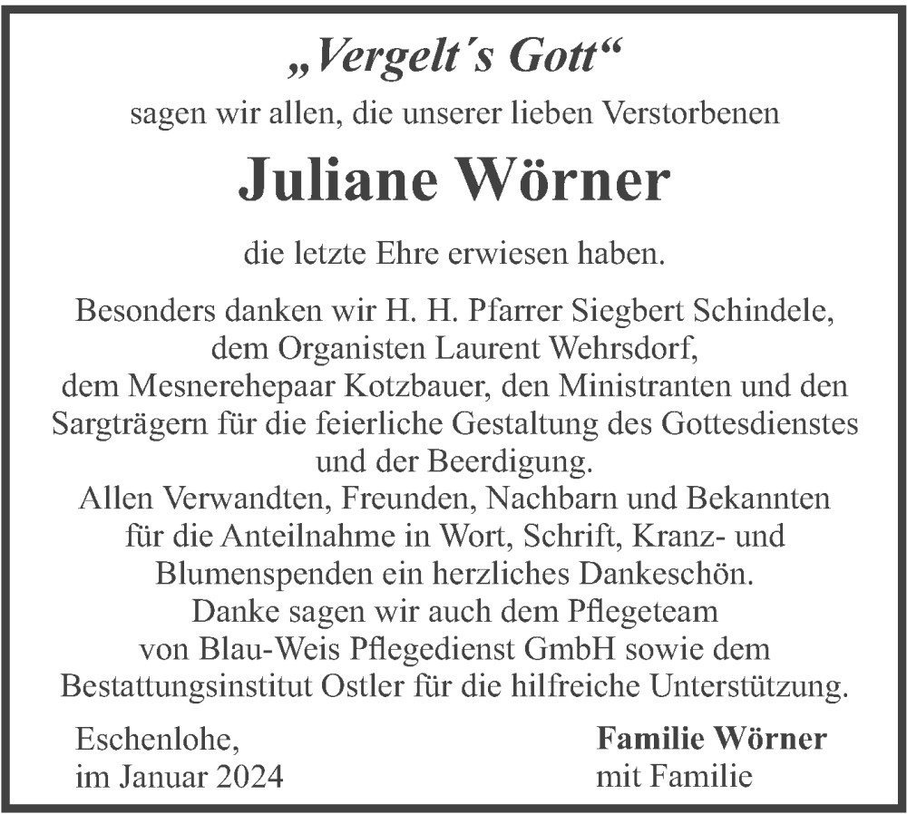 Hier finden Sie alle Traueranzeigen aus der Zeitung, die bisher für Juliane Wörner erschienen sind. Weitere Traueranzeigen, die in der Zeitung erscheinen, werden hier ebenfalls aufgelistet