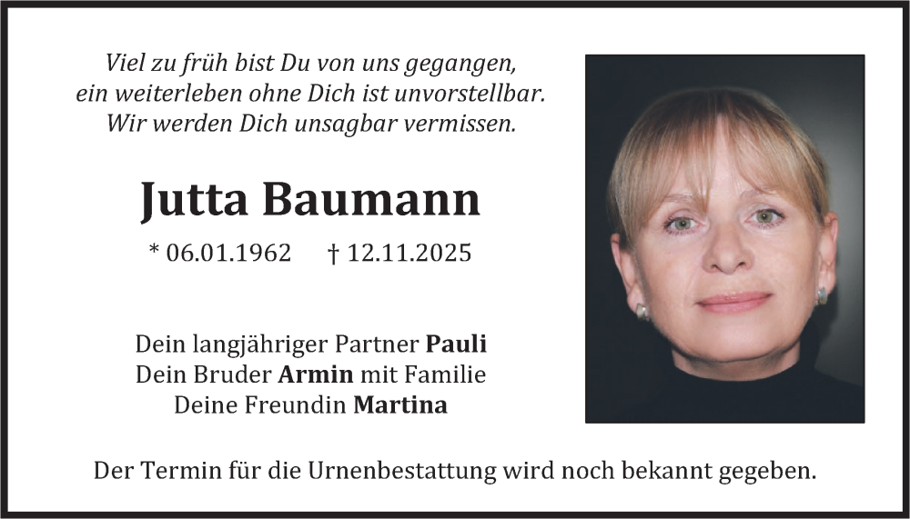 Hier finden Sie alle Traueranzeigen aus der Zeitung, die bisher für Jutta Baumann erschienen sind. Weitere Traueranzeigen, die in der Zeitung erscheinen, werden hier ebenfalls aufgelistet