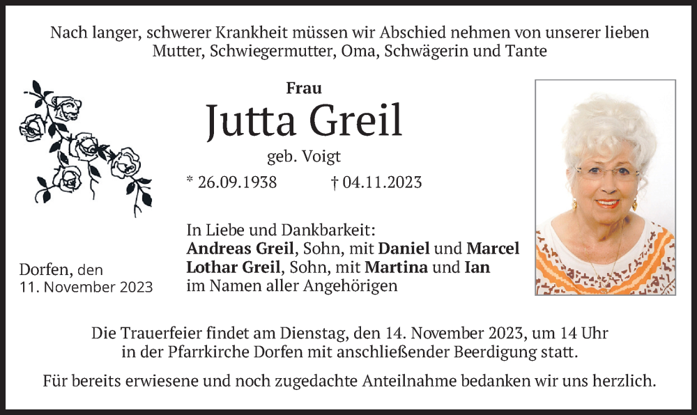 Hier finden Sie alle Traueranzeigen aus der Zeitung, die bisher für Jutta Greil erschienen sind. Weitere Traueranzeigen, die in der Zeitung erscheinen, werden hier ebenfalls aufgelistet