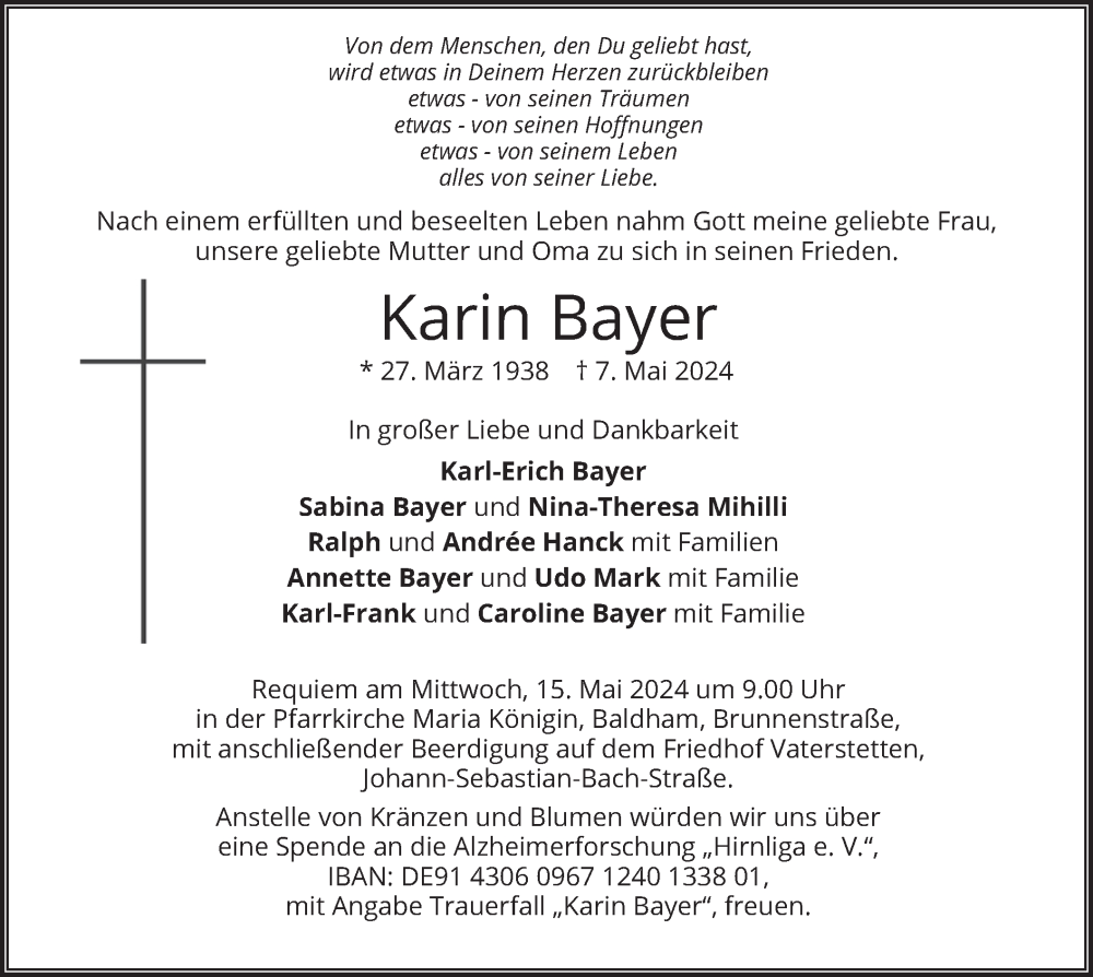 Hier finden Sie alle Traueranzeigen aus der Zeitung, die bisher für Karin Bayer erschienen sind. Weitere Traueranzeigen, die in der Zeitung erscheinen, werden hier ebenfalls aufgelistet