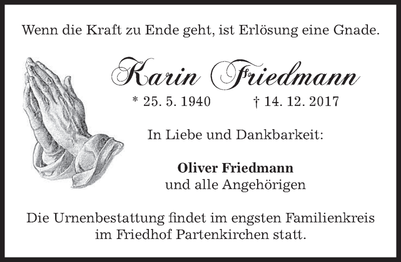 Hier finden Sie alle Traueranzeigen aus der Zeitung, die bisher für Karin Friedmann erschienen sind. Weitere Traueranzeigen, die in der Zeitung erscheinen, werden hier ebenfalls aufgelistet