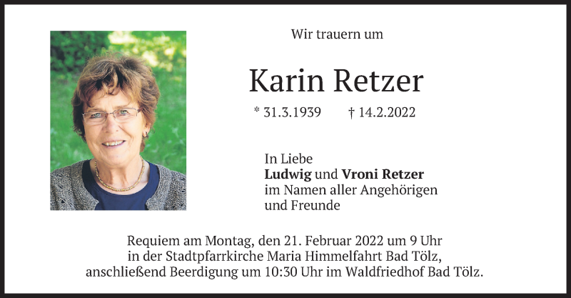 Hier finden Sie alle Traueranzeigen aus der Zeitung, die bisher für Karin Retzer erschienen sind. Weitere Traueranzeigen, die in der Zeitung erscheinen, werden hier ebenfalls aufgelistet