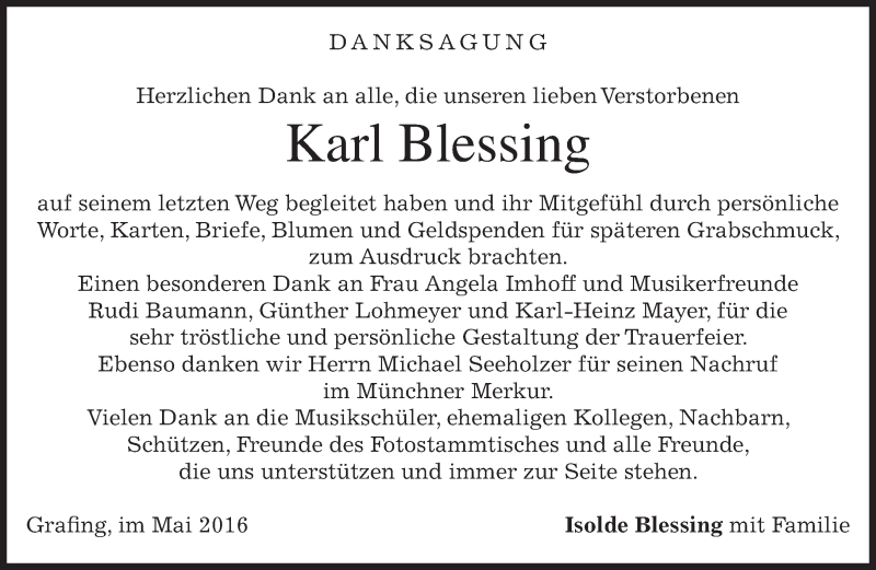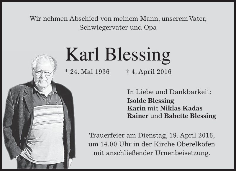 Hier finden Sie alle Traueranzeigen aus der Zeitung, die bisher für Karl Blessing erschienen sind. Weitere Traueranzeigen, die in der Zeitung erscheinen, werden hier ebenfalls aufgelistet