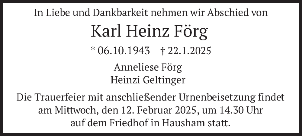 Hier finden Sie alle Traueranzeigen aus der Zeitung, die bisher für Karl Heinz Förg erschienen sind. Weitere Traueranzeigen, die in der Zeitung erscheinen, werden hier ebenfalls aufgelistet