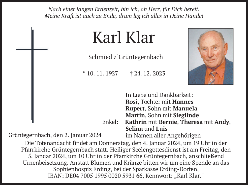 Hier finden Sie alle Traueranzeigen aus der Zeitung, die bisher für Karl Klar erschienen sind. Weitere Traueranzeigen, die in der Zeitung erscheinen, werden hier ebenfalls aufgelistet