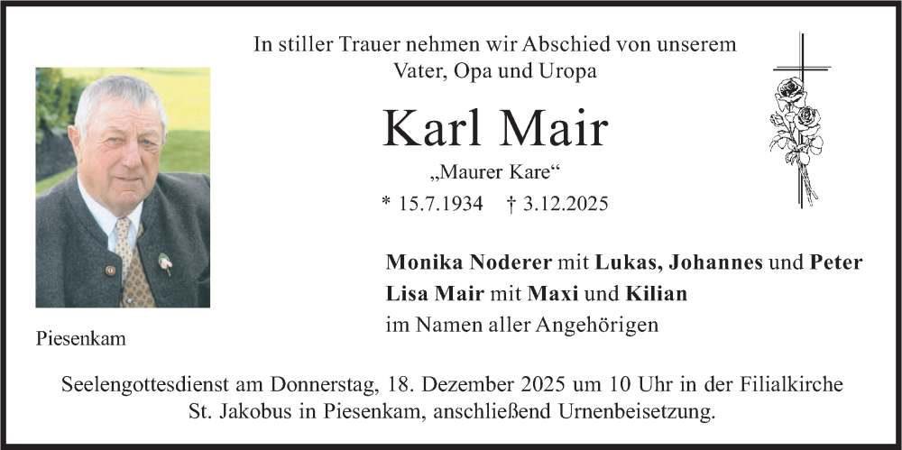 Hier finden Sie alle Traueranzeigen aus der Zeitung, die bisher für Karl Mair erschienen sind. Weitere Traueranzeigen, die in der Zeitung erscheinen, werden hier ebenfalls aufgelistet