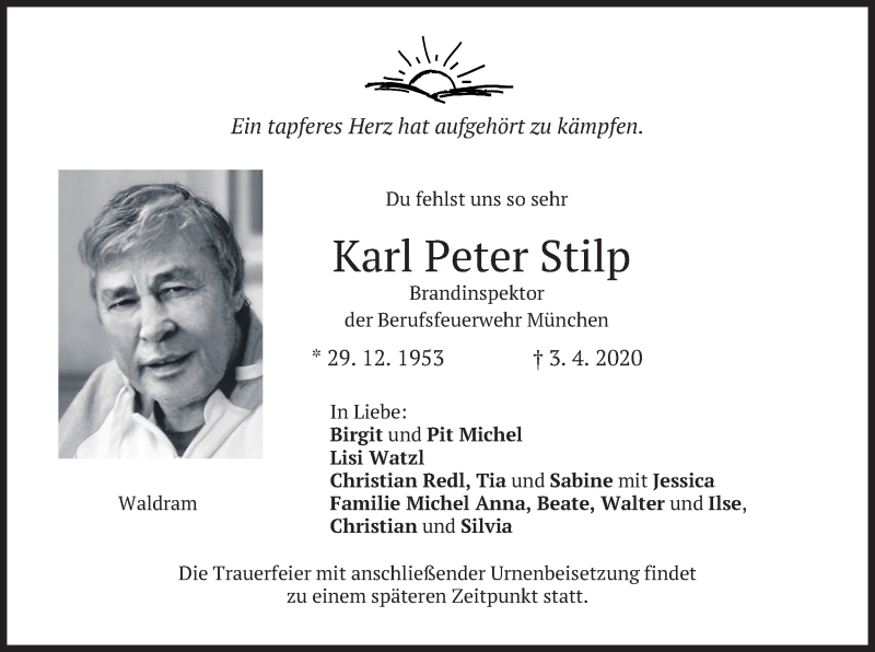 Hier finden Sie alle Traueranzeigen aus der Zeitung, die bisher für Karl Peter Stilp erschienen sind. Weitere Traueranzeigen, die in der Zeitung erscheinen, werden hier ebenfalls aufgelistet