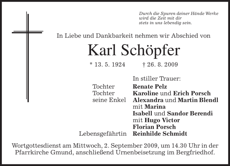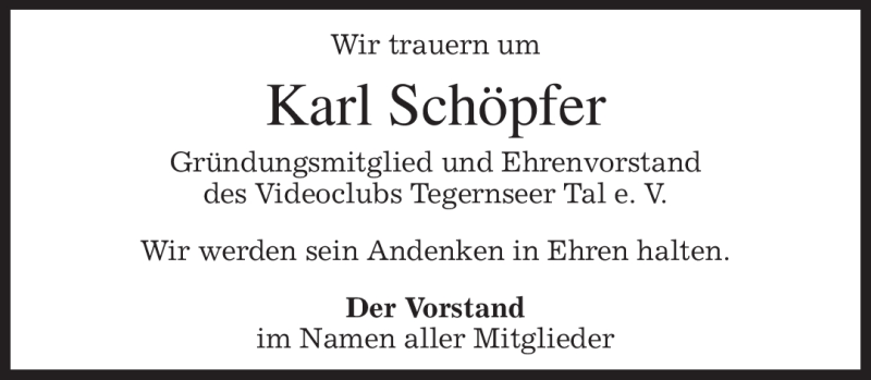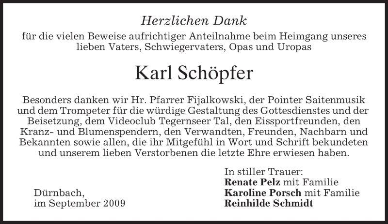 Hier finden Sie alle Traueranzeigen aus der Zeitung, die bisher für Karl Schöpfer erschienen sind. Weitere Traueranzeigen, die in der Zeitung erscheinen, werden hier ebenfalls aufgelistet