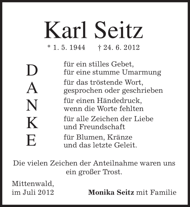 Hier finden Sie alle Traueranzeigen aus der Zeitung, die bisher für Karl Seitz erschienen sind. Weitere Traueranzeigen, die in der Zeitung erscheinen, werden hier ebenfalls aufgelistet