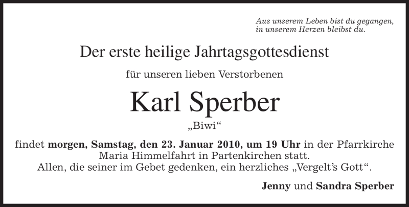 Hier finden Sie alle Traueranzeigen aus der Zeitung, die bisher für Karl Sperber erschienen sind. Weitere Traueranzeigen, die in der Zeitung erscheinen, werden hier ebenfalls aufgelistet