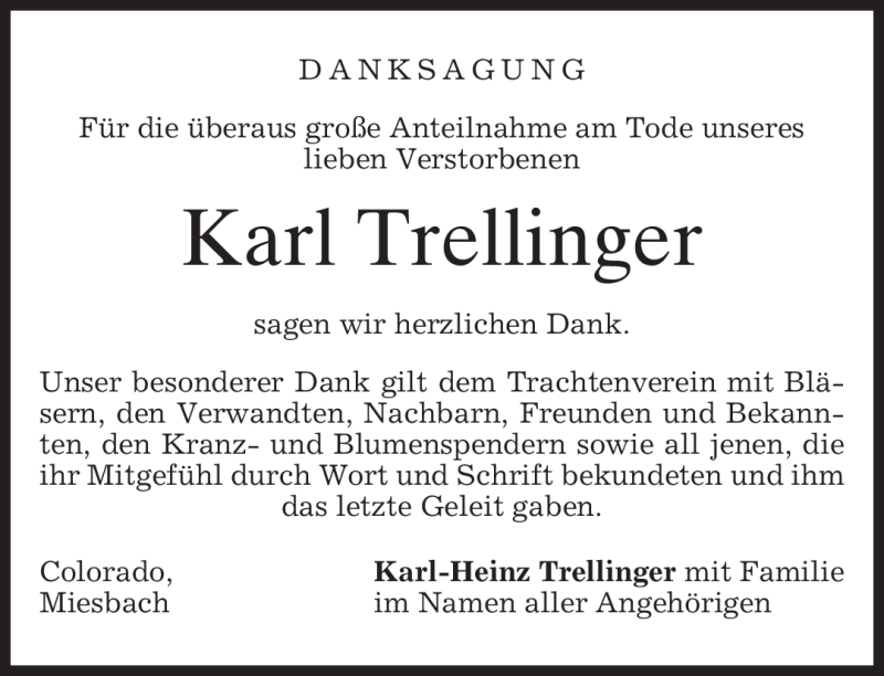Hier finden Sie alle Traueranzeigen aus der Zeitung, die bisher für Karl Trellinger erschienen sind. Weitere Traueranzeigen, die in der Zeitung erscheinen, werden hier ebenfalls aufgelistet