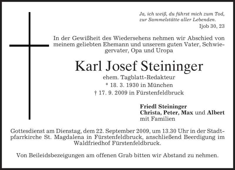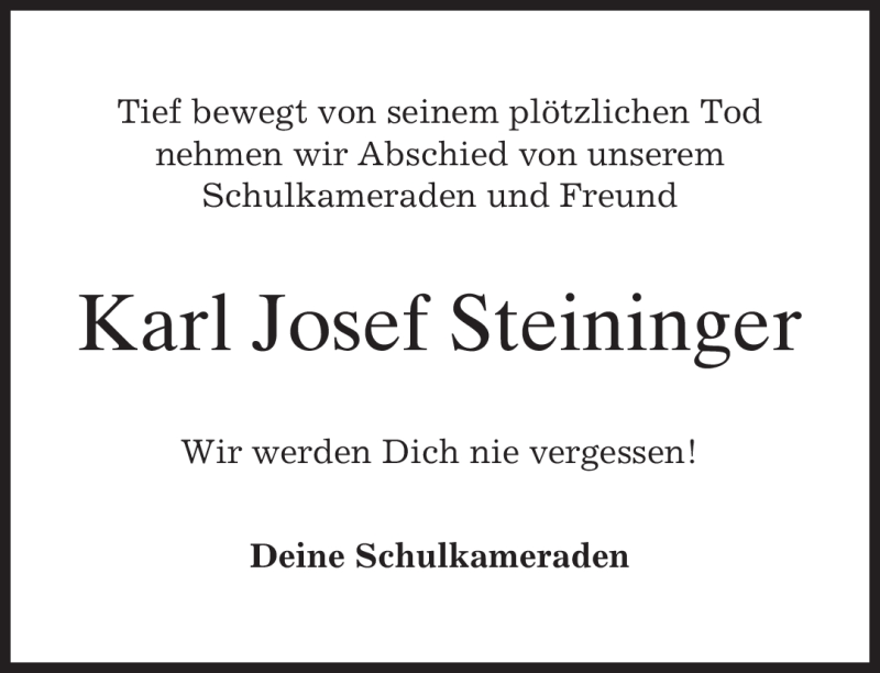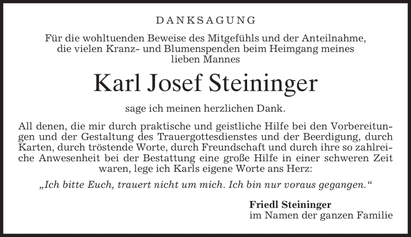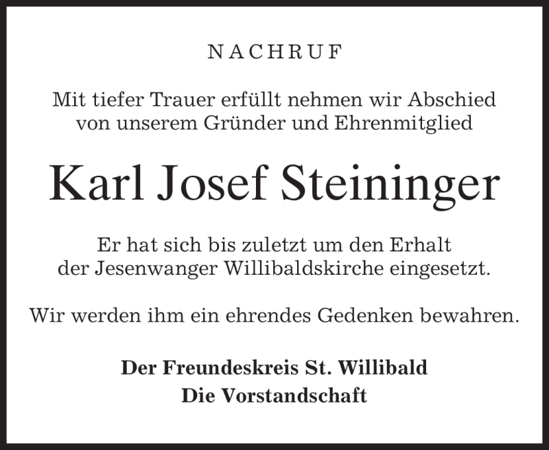 Hier finden Sie alle Traueranzeigen aus der Zeitung, die bisher für Karl Josef Steininger erschienen sind. Weitere Traueranzeigen, die in der Zeitung erscheinen, werden hier ebenfalls aufgelistet