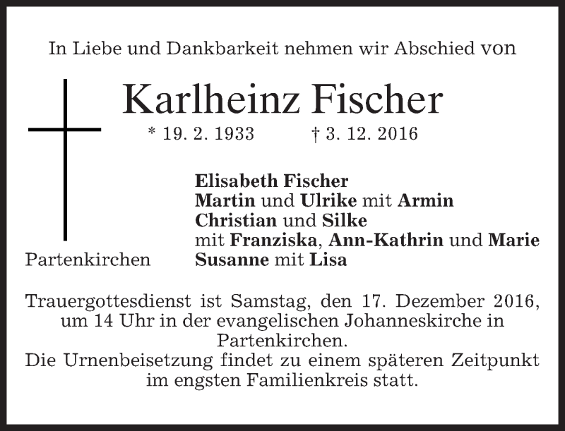 Hier finden Sie alle Traueranzeigen aus der Zeitung, die bisher für Karlheinz Fischer erschienen sind. Weitere Traueranzeigen, die in der Zeitung erscheinen, werden hier ebenfalls aufgelistet
