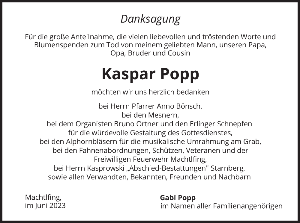 Hier finden Sie alle Traueranzeigen aus der Zeitung, die bisher für Kaspar Popp erschienen sind. Weitere Traueranzeigen, die in der Zeitung erscheinen, werden hier ebenfalls aufgelistet