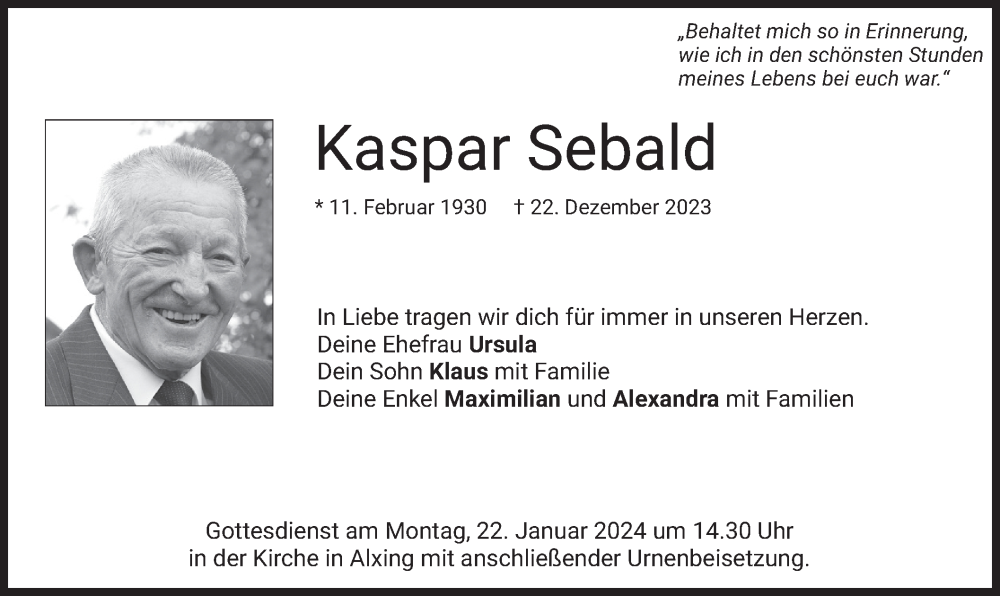 Hier finden Sie alle Traueranzeigen aus der Zeitung, die bisher für Kaspar Sebald erschienen sind. Weitere Traueranzeigen, die in der Zeitung erscheinen, werden hier ebenfalls aufgelistet