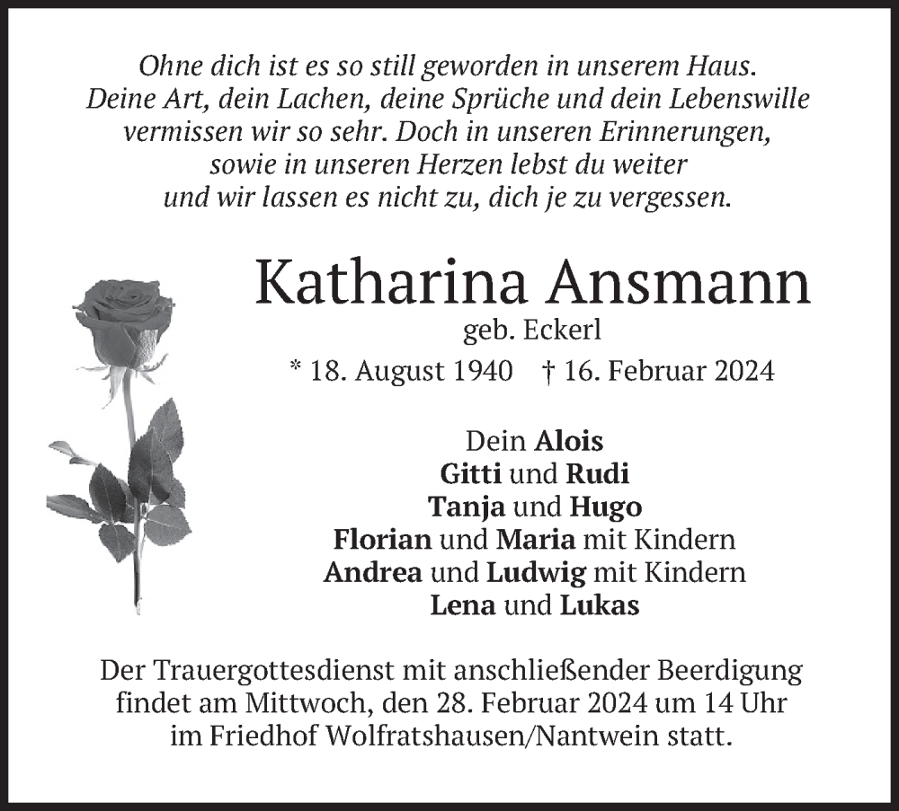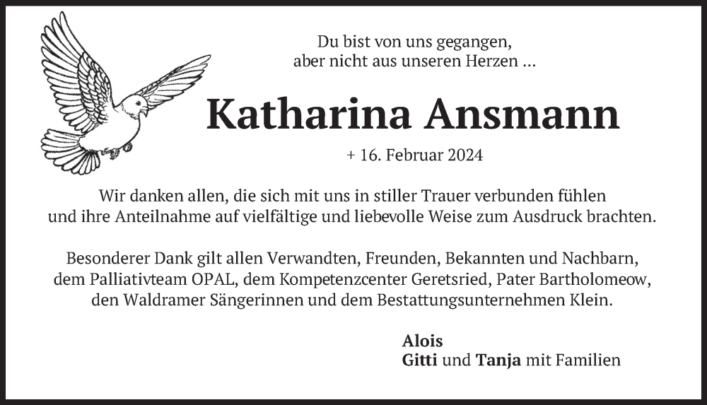 Hier finden Sie alle Traueranzeigen aus der Zeitung, die bisher für Katharina Ansmann erschienen sind. Weitere Traueranzeigen, die in der Zeitung erscheinen, werden hier ebenfalls aufgelistet