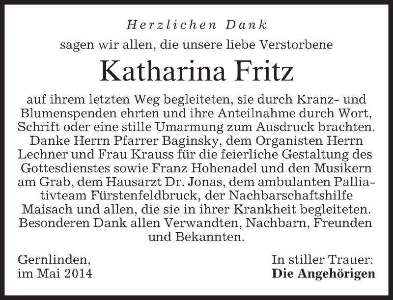 Hier finden Sie alle Traueranzeigen aus der Zeitung, die bisher für Katharina Fritz erschienen sind. Weitere Traueranzeigen, die in der Zeitung erscheinen, werden hier ebenfalls aufgelistet