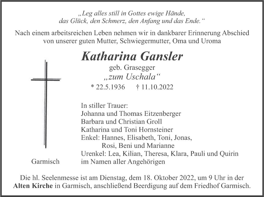Hier finden Sie alle Traueranzeigen aus der Zeitung, die bisher für Katharina Gansler erschienen sind. Weitere Traueranzeigen, die in der Zeitung erscheinen, werden hier ebenfalls aufgelistet