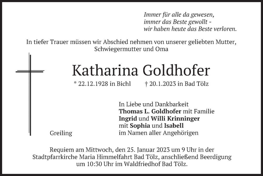 Hier finden Sie alle Traueranzeigen aus der Zeitung, die bisher für Katharina Goldhofer erschienen sind. Weitere Traueranzeigen, die in der Zeitung erscheinen, werden hier ebenfalls aufgelistet