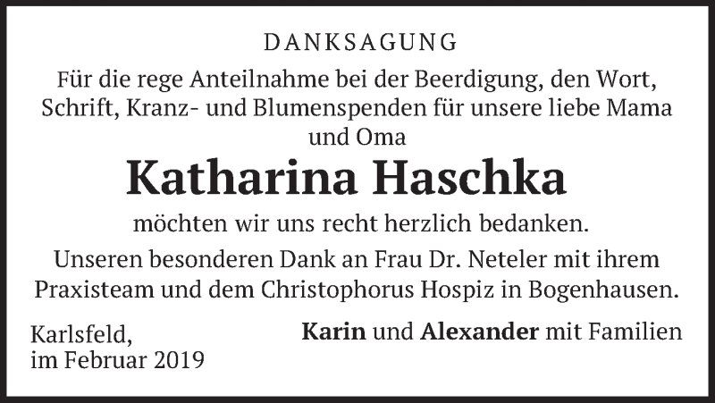Hier finden Sie alle Traueranzeigen aus der Zeitung, die bisher für Katharina Haschka erschienen sind. Weitere Traueranzeigen, die in der Zeitung erscheinen, werden hier ebenfalls aufgelistet