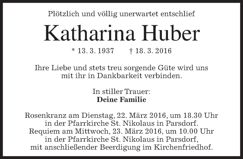 Hier finden Sie alle Traueranzeigen aus der Zeitung, die bisher für Katharina Huber erschienen sind. Weitere Traueranzeigen, die in der Zeitung erscheinen, werden hier ebenfalls aufgelistet