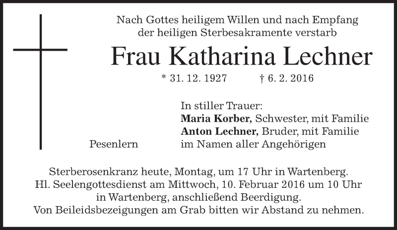 Hier finden Sie alle Traueranzeigen aus der Zeitung, die bisher für Katharina Lechner erschienen sind. Weitere Traueranzeigen, die in der Zeitung erscheinen, werden hier ebenfalls aufgelistet