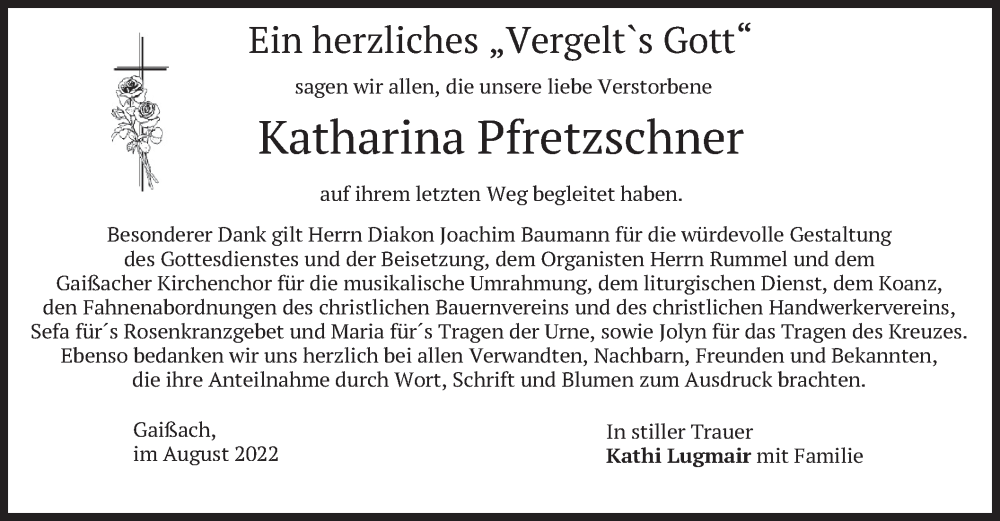 Hier finden Sie alle Traueranzeigen aus der Zeitung, die bisher für Katharina Pfretzschner erschienen sind. Weitere Traueranzeigen, die in der Zeitung erscheinen, werden hier ebenfalls aufgelistet