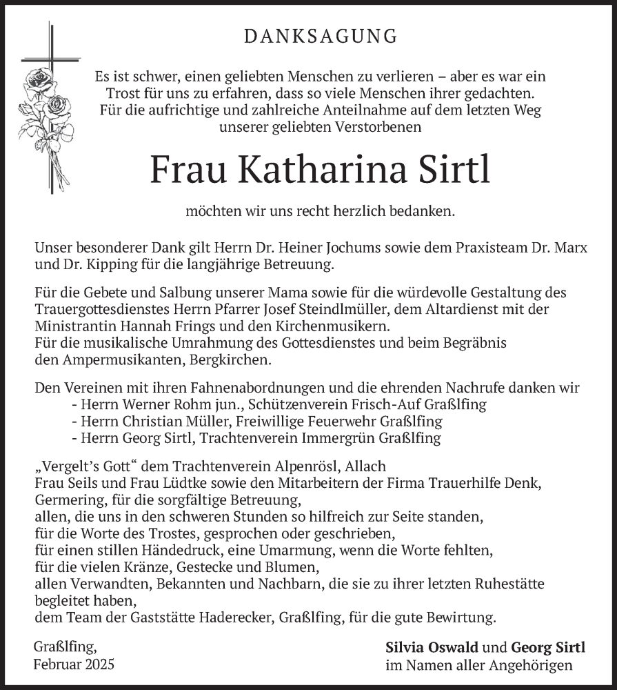 Hier finden Sie alle Traueranzeigen aus der Zeitung, die bisher für Katharina Sirtl erschienen sind. Weitere Traueranzeigen, die in der Zeitung erscheinen, werden hier ebenfalls aufgelistet