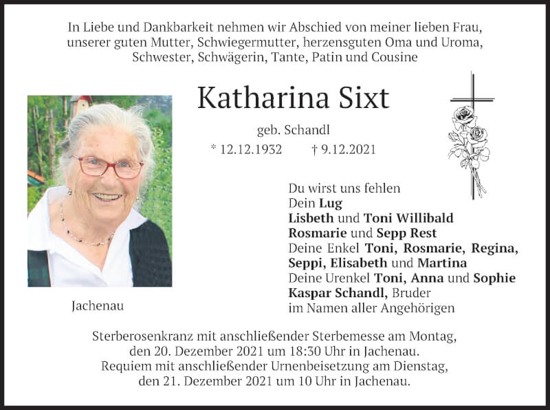Hier finden Sie alle Traueranzeigen aus der Zeitung, die bisher für Katharina Sixt erschienen sind. Weitere Traueranzeigen, die in der Zeitung erscheinen, werden hier ebenfalls aufgelistet