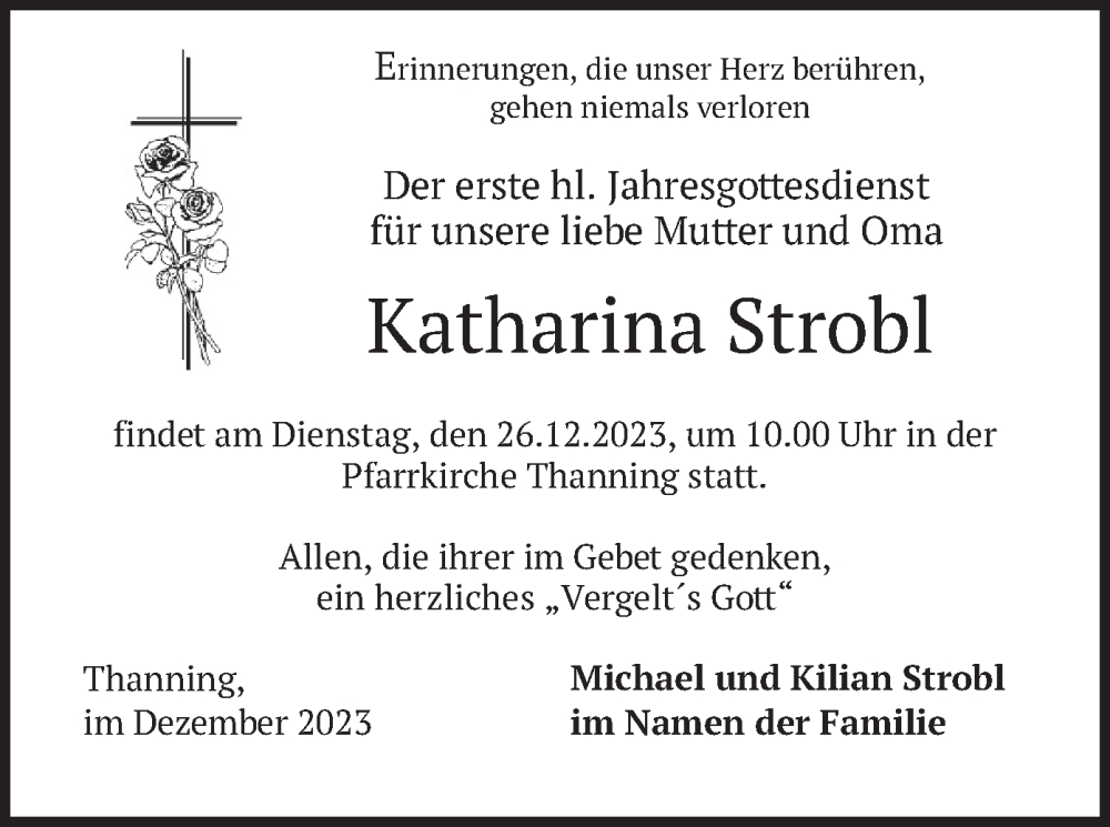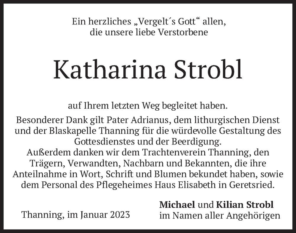 Hier finden Sie alle Traueranzeigen aus der Zeitung, die bisher für Katharina Strobl erschienen sind. Weitere Traueranzeigen, die in der Zeitung erscheinen, werden hier ebenfalls aufgelistet