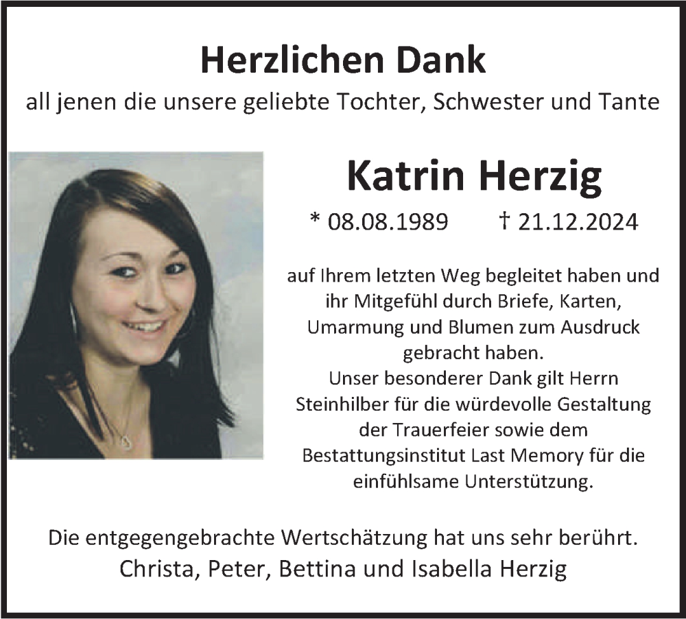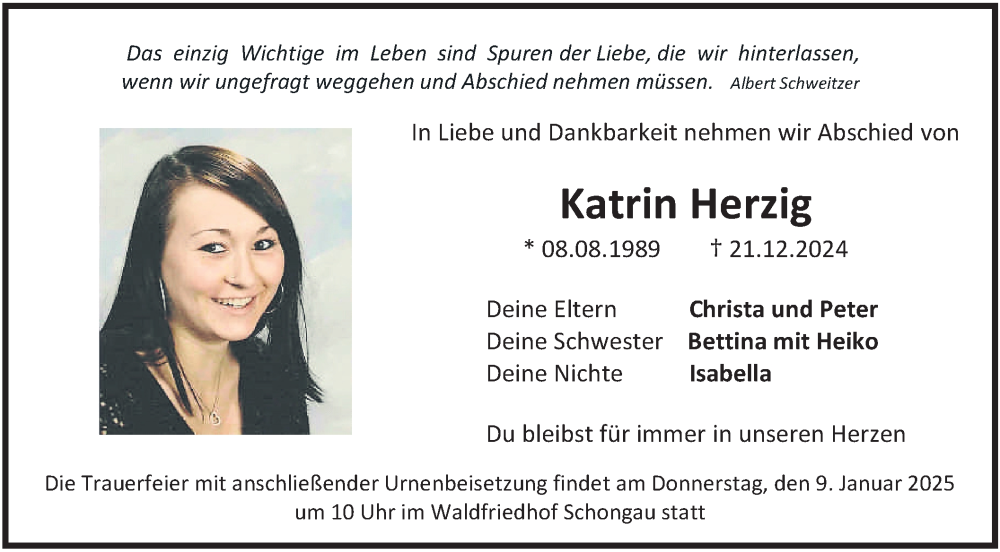 Hier finden Sie alle Traueranzeigen aus der Zeitung, die bisher für Katrin Herzig erschienen sind. Weitere Traueranzeigen, die in der Zeitung erscheinen, werden hier ebenfalls aufgelistet