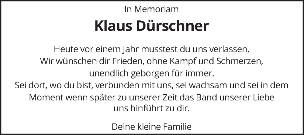 Hier finden Sie alle Traueranzeigen aus der Zeitung, die bisher für Klaus Dürschner erschienen sind. Weitere Traueranzeigen, die in der Zeitung erscheinen, werden hier ebenfalls aufgelistet