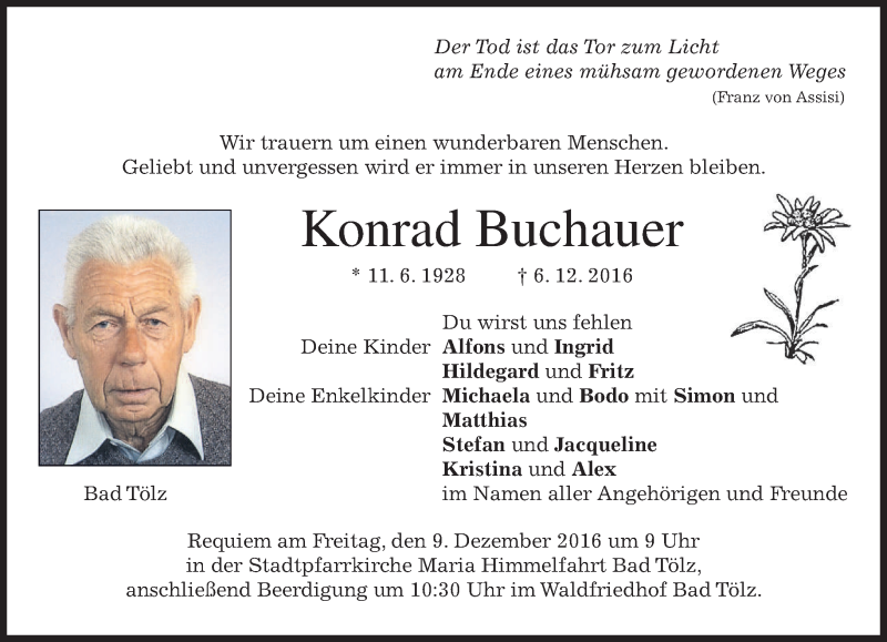 Hier finden Sie alle Traueranzeigen aus der Zeitung, die bisher für Konrad Buchauer erschienen sind. Weitere Traueranzeigen, die in der Zeitung erscheinen, werden hier ebenfalls aufgelistet