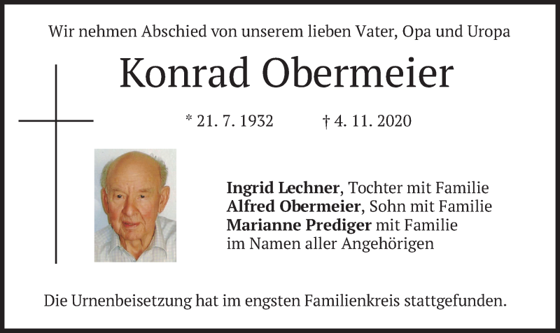 Hier finden Sie alle Traueranzeigen aus der Zeitung, die bisher für Konrad Obermeier erschienen sind. Weitere Traueranzeigen, die in der Zeitung erscheinen, werden hier ebenfalls aufgelistet