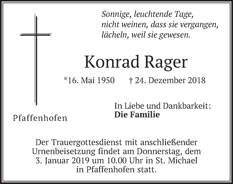Hier finden Sie alle Traueranzeigen aus der Zeitung, die bisher für Konrad Rager erschienen sind. Weitere Traueranzeigen, die in der Zeitung erscheinen, werden hier ebenfalls aufgelistet