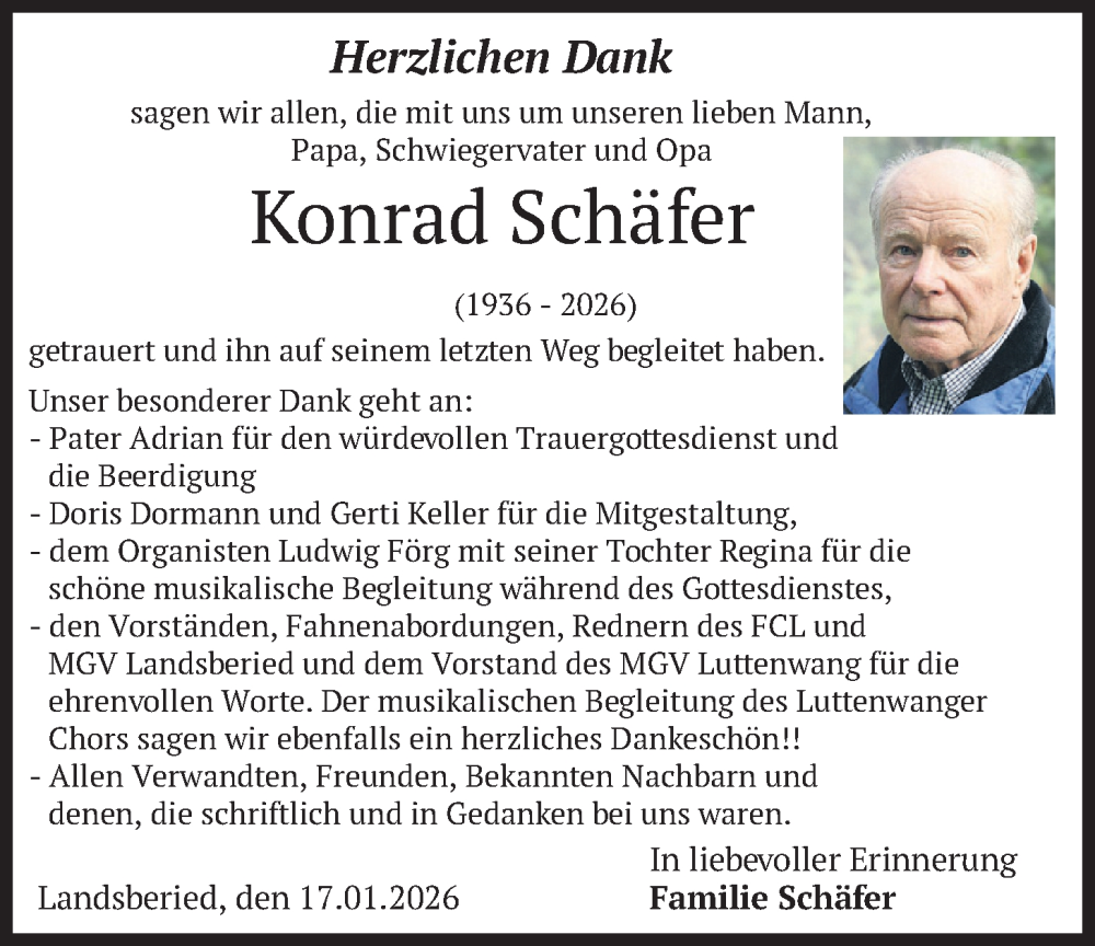 Hier finden Sie alle Traueranzeigen aus der Zeitung, die bisher für Konrad Schäfer erschienen sind. Weitere Traueranzeigen, die in der Zeitung erscheinen, werden hier ebenfalls aufgelistet