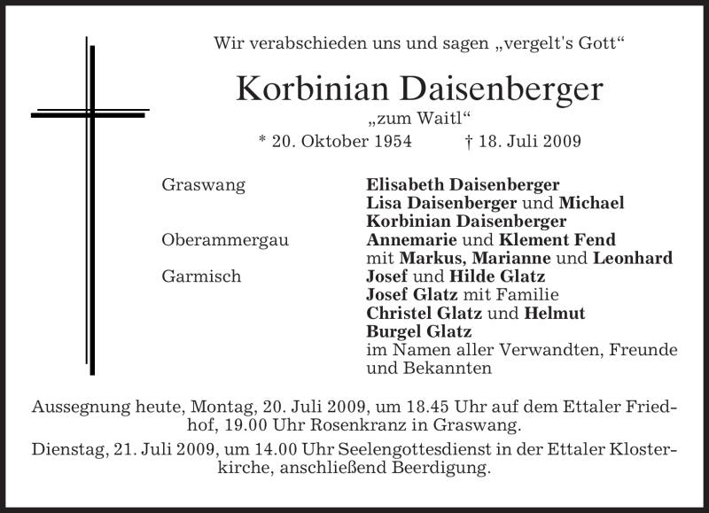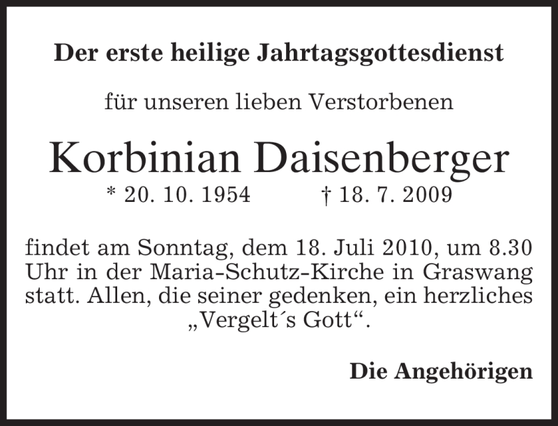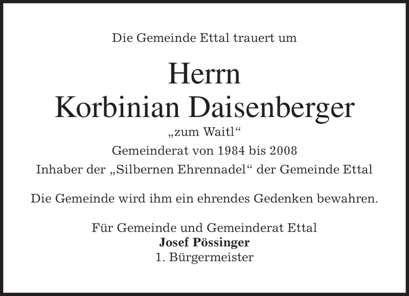 Hier finden Sie alle Traueranzeigen aus der Zeitung, die bisher für Korbinian Daisenberger erschienen sind. Weitere Traueranzeigen, die in der Zeitung erscheinen, werden hier ebenfalls aufgelistet