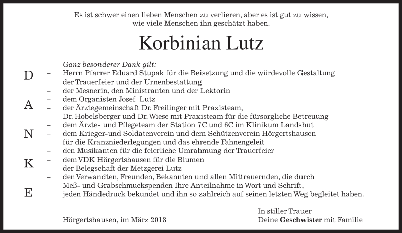 Hier finden Sie alle Traueranzeigen aus der Zeitung, die bisher für Korbinian Lutz erschienen sind. Weitere Traueranzeigen, die in der Zeitung erscheinen, werden hier ebenfalls aufgelistet