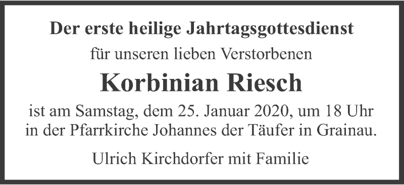 Hier finden Sie alle Traueranzeigen aus der Zeitung, die bisher für Korbinian Riesch erschienen sind. Weitere Traueranzeigen, die in der Zeitung erscheinen, werden hier ebenfalls aufgelistet