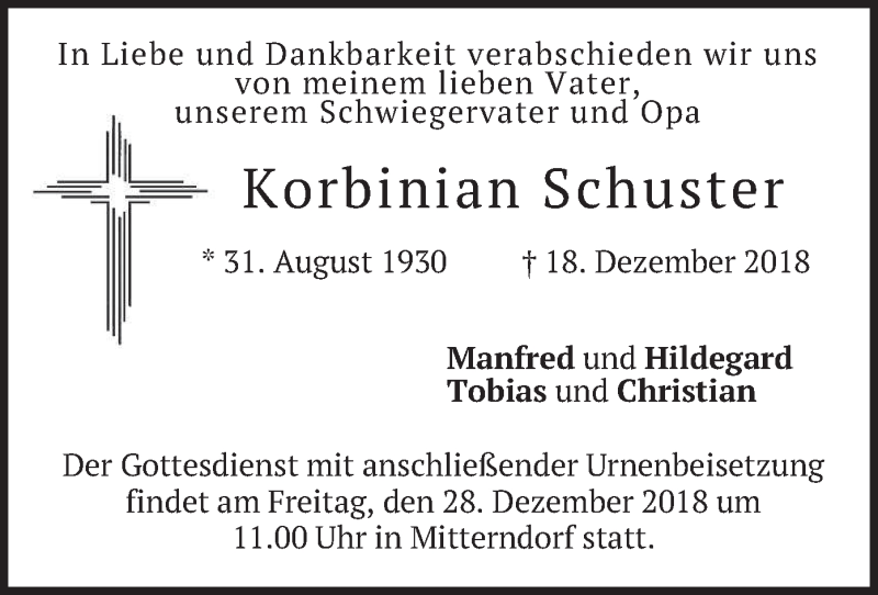 Hier finden Sie alle Traueranzeigen aus der Zeitung, die bisher für Korbinian Schuster erschienen sind. Weitere Traueranzeigen, die in der Zeitung erscheinen, werden hier ebenfalls aufgelistet