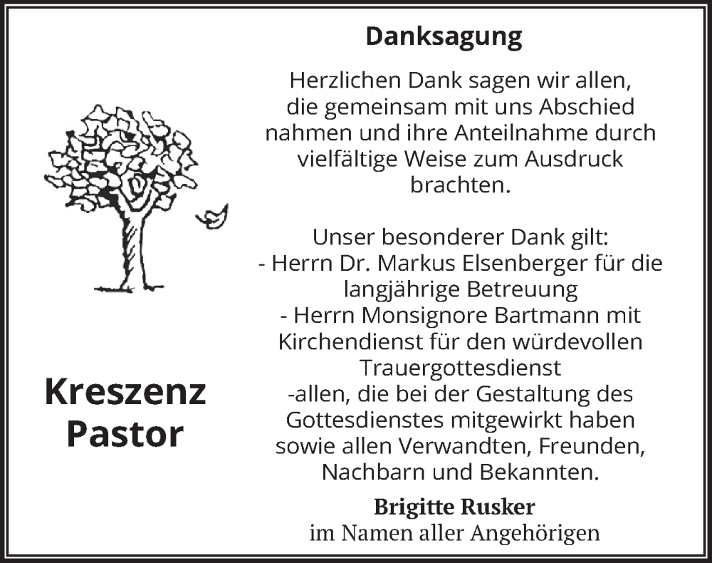 Hier finden Sie alle Traueranzeigen aus der Zeitung, die bisher für Kreszenz Pastor erschienen sind. Weitere Traueranzeigen, die in der Zeitung erscheinen, werden hier ebenfalls aufgelistet