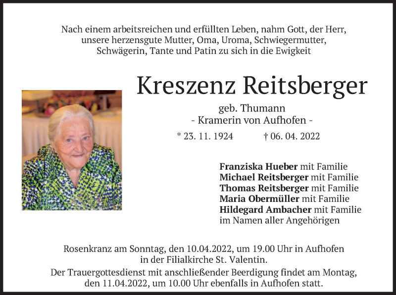Hier finden Sie alle Traueranzeigen aus der Zeitung, die bisher für Kreszenz Reitsberger erschienen sind. Weitere Traueranzeigen, die in der Zeitung erscheinen, werden hier ebenfalls aufgelistet