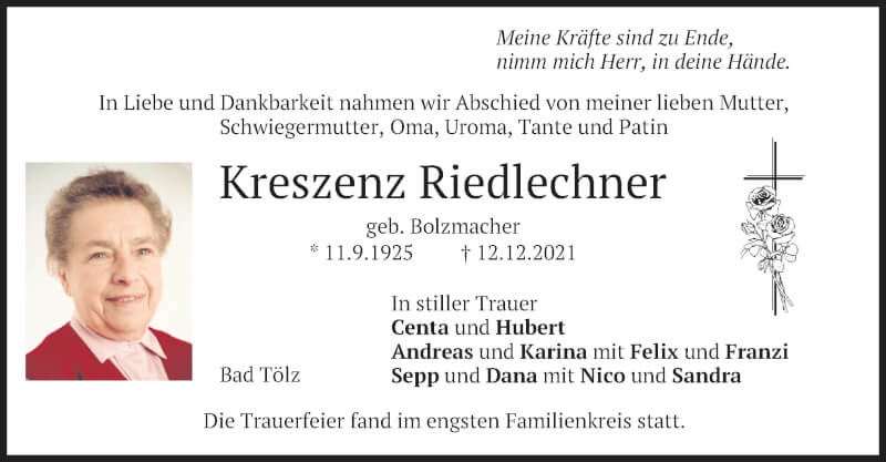 Hier finden Sie alle Traueranzeigen aus der Zeitung, die bisher für Kreszenz Riedlechner erschienen sind. Weitere Traueranzeigen, die in der Zeitung erscheinen, werden hier ebenfalls aufgelistet