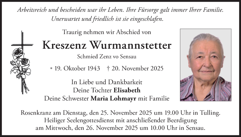 Hier finden Sie alle Traueranzeigen aus der Zeitung, die bisher für Kreszenz Wurmannstetter erschienen sind. Weitere Traueranzeigen, die in der Zeitung erscheinen, werden hier ebenfalls aufgelistet